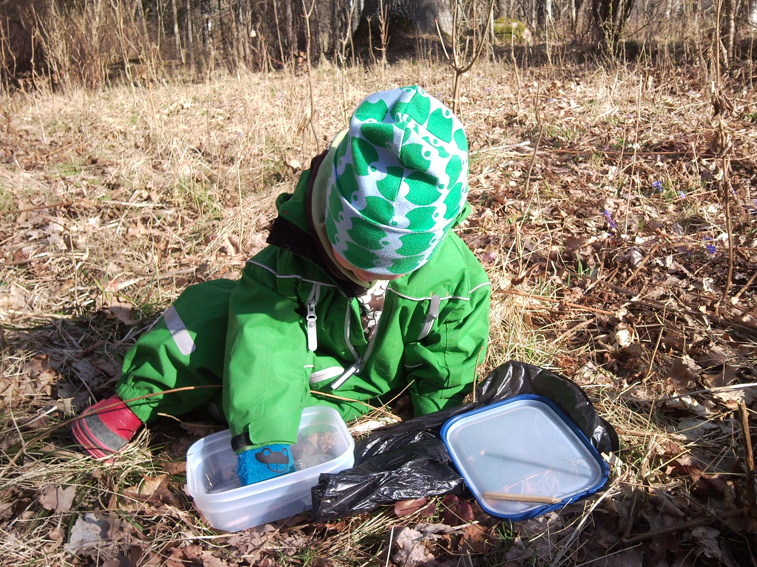 Ser inte en enda bil och parkerar vid bommen till golfbanan där det är kortaste fågelvägen till cachen. Pannlampan tänds och jag rusar genom hallonsnår och elände innan jag kommer ut på cykelbanan, fortsätter in i skogen hoppar över några sanka områden och närmar mig nollan, ser till min besvikelse en ficklampa. Ber till caching guden att man inte hittat burken än. Kommer fram och stöter på PelleQ med dotter. Som intygar att dom inte hittat burken, tackar min gud som strax belönar mig med att överge mig, då PelleQ ropar att hon hittat burken…![]()